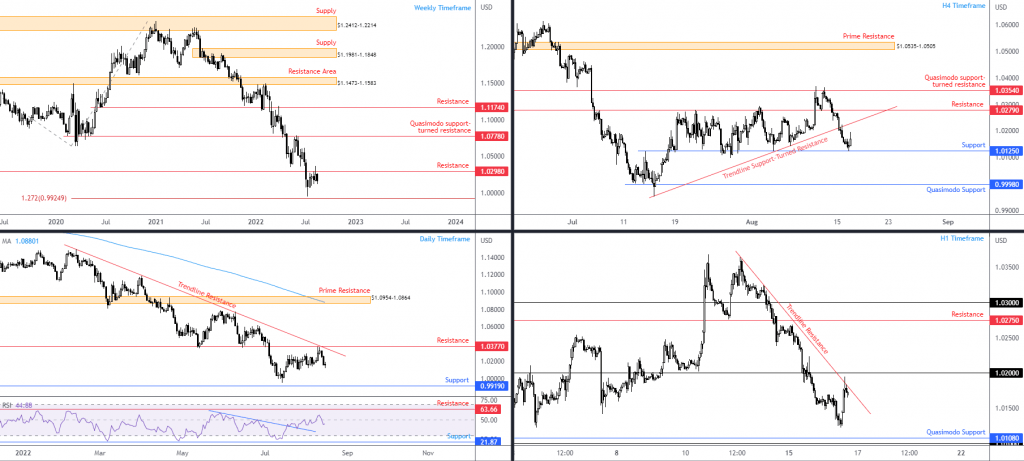 The H4 timeframe, in support of the downside bias, shows price tunnelled through trendline support, drawn from the low $0.9952, and shook hands with support at $1.0125. While the latter has stood its ground, a breach shines the technical spotlight on Quasimodo support from $0.9998. A closer reading of price action on the H1 chart demonstrates the currency pair recently connected with trendline resistance (extended from the high $1.0364), missing $1.02 by a hair. Downside support falls in at $1.0108 (Quasimodo formation) and $1.01.