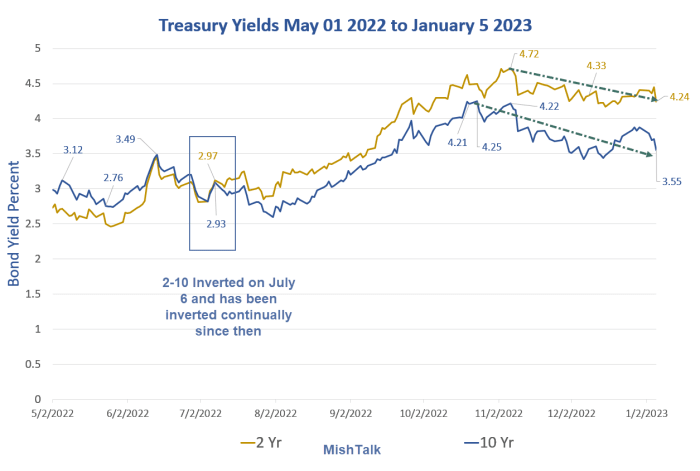 The 2-10 treasury yield spread note has been inverted since July 6, 2022