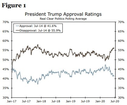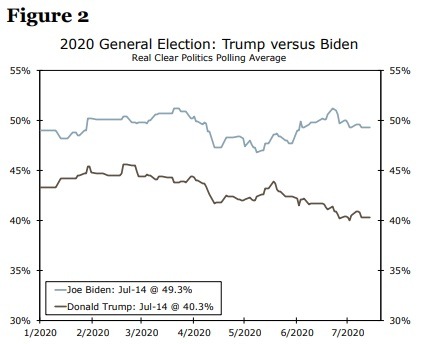 The 2020 U.S. Presidential election is scheduled for November 3, and there are some key dates on the horizon that signal the heart of campaign season will soon be upon us. The Democratic and Republican National Conventions are scheduled for August 17-20 and August 24-27, respectively, and Democratic candidate Joe Biden has suggested that a Vice President pick will likely take place sometime around August 1. In this report, we take stock of where the races for the White House and Congress stand. At present, Joe Biden has a sizable lead in the national polls, nearly three times bigger than the lead Hillary Clinton had in mid-July 2016. Polling at the Congressional level looks equally as robust for the Democrats. This strength in recent polling data is reflected in betting markets, which are increasingly priced for a Democratic sweep. If the election were held today, we suspect Joe Biden would rightly be considered a healthy favorite going into the vote tally.