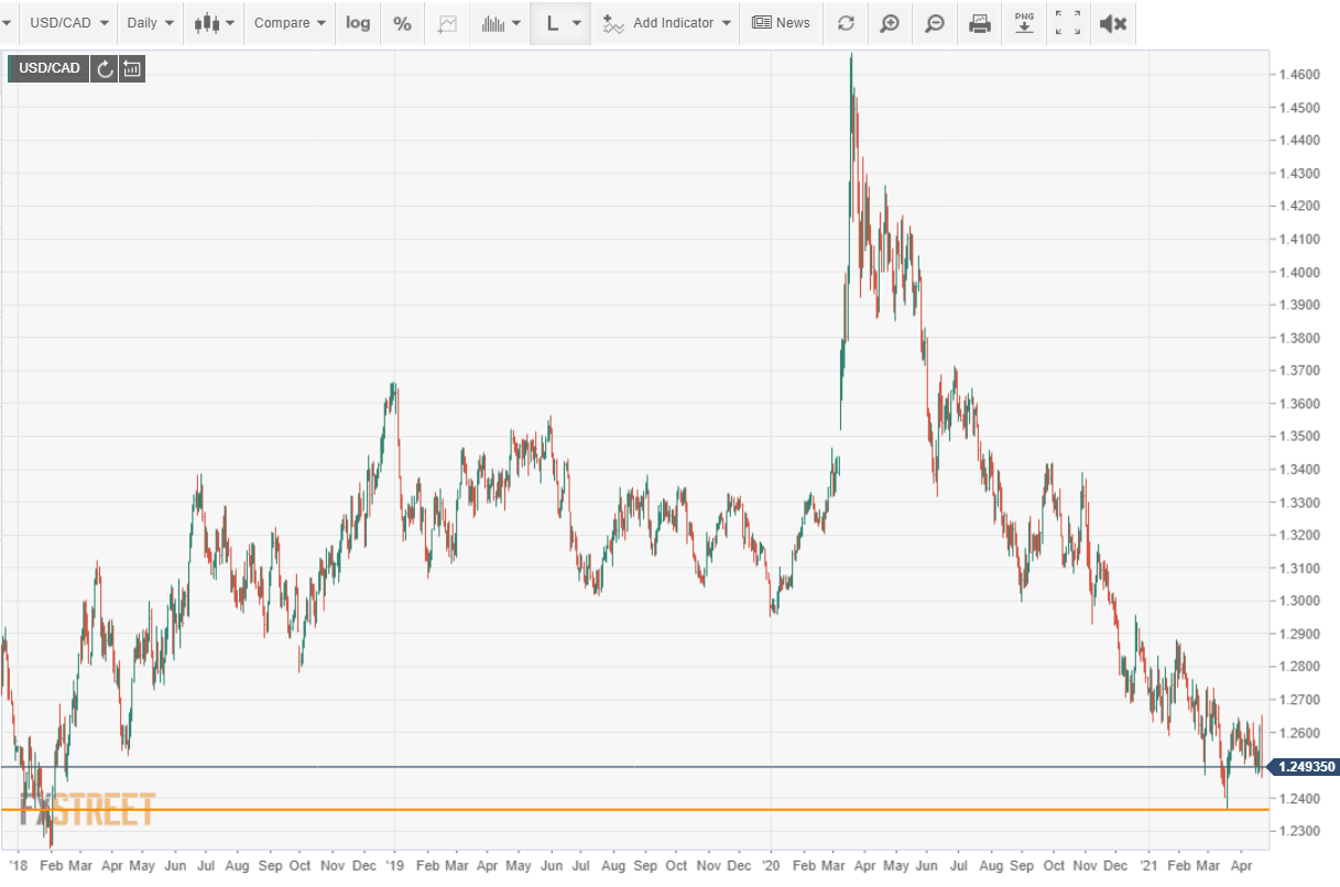 The USD/CAD closed at the bottom of its four-week range but it is still more than a figure above the three-year March 18 low of 1.2365.