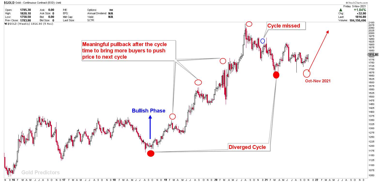 A very old chart shown to premium members presents that gold prices bottomed at $1,680 on the diverged cycle of March 10th, 2021, and are now rising. It has been stated numerous times that another bottom is expected to form in the months of October or November 2021, with the ideal spot being $1,700-$1,725. The low was formed on September 29-30 at $1,722, and prices are rising in October. Certain parameters must be considered due to the current market environment. Price prediction is a distinct concept, while confirmation on technical charts is a distinct aspect. This article will focus on a few technical charts to illustrate the development of potential gold price movements in the coming weeks and months.