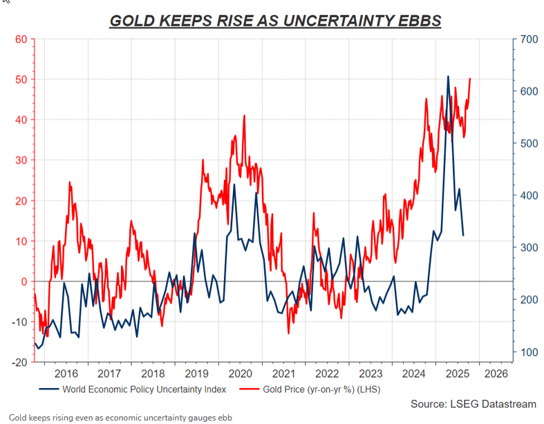 Tidbit: Reuters points out that gold itself is in a bubble, up about 56% year-to-date and still rising, despite a relaxation in an uncertainty index. We have no idea how the uncertainty index is calculated but it seems intuitively obvious that as long as Trump is in the White House, uncertainty is hardly going to fall and can only rise. We still have the Fed takeover, a potential partial default on the debt, and heaven only knows what other havoc he will wreak.