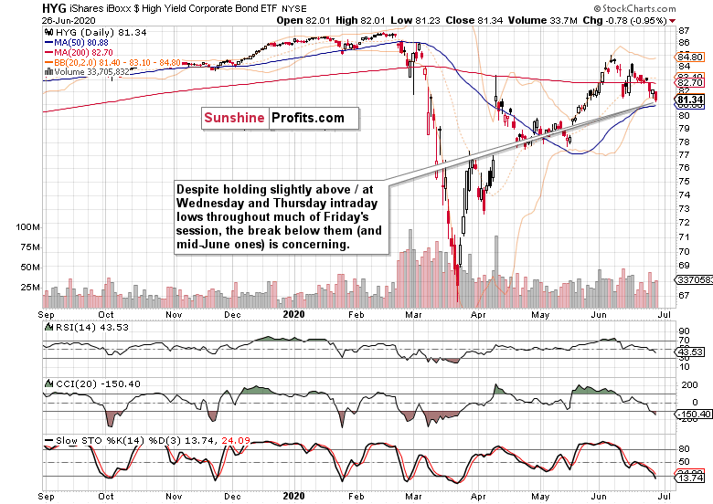 High yield corporate bonds (HYG ETF) broke below the Wednesday and Thursday intraday lows in the end, and the daily indicators don't rule out more deterioration. Not good for the stock bulls.