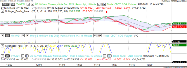 Yesterday the ZN made it's move at around 2:30 PM EST. The ZN hit a High at around that time and the S&P moved Higher. If you look at the charts below ZN gave a signal at around 2:30 PM EST and the S&P moved Higher at around the same time. Look at the charts below and you'll see a pattern for both assets. ZN hit a High at around 2:30 PM EST and the S&P was moving Higher shortly thereafter. These charts represent the newest version of MultiCharts and I've changed the timeframe to a 15 minute chart to display better. This represented a Shorting opportunity on the 10 year note, as a trader you could have netted about 20 plus ticks per contract on this trade. Each tick is worth $15.625. Please note: the front month for the ZN is now Dec '21. The S&P contract is now Dec '21 as well. I've changed the format to Renko bars such that it may be more apparent and visible.