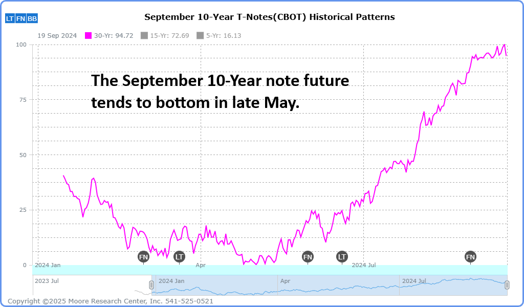 The Treasury futures market tends to find a significant low in the early summer months and rally into fall. Although seasonality isn’t certain, it is likely. The accompanying chart depicts the path traveled most often by the September 10-year note future over the previous 30 years. Betting against historical norms will work occasionally, but it is a low-probability trade.
