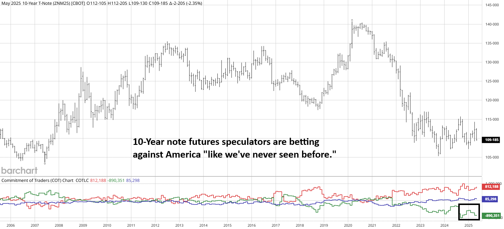 Large speculators have been holding historically significant bearish bets against US Treasuries. These bets against America are being placed in anticipation of a repricing of the bond market to account for increased default risk and a lower credit rating by Moody’s. However, the bulk of the selling took place a few years ago; since then, the shorts have maintained their position because they have yet to be proven wrong. However, if that time ever comes, there will be substantially more buyers in the market than sellers, and the rally will rip faces off without regard to humanity. Did we expect it to take this long to play out? No. Do we think the multi-year consolidation changes the outcome? No. The Treasury market, and its participants, are working through years of manipulation in the form of Quantitative Easing and later Quantitative Tightening, an explosion in money supply, inflation, and government spending, and now a reorganization of global trade and a credit rating downgrade. It is conceivable to assume that anyone who wanted to sell Treasuries probably already has done so. The current net short position held by speculators dwarfs anything we have seen in the past; eventually, it will have to be unwound.