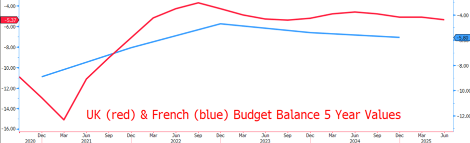 There is an addiction problem in both the UK and France, an addiction to credit, with the respective budget deficits of both shown above, looking similar on the surface. And so when the French PM Bayrou lost his confidence vote over a fiscal issue, we may have expected a similar reaction in French assets to what we saw happen to UK assets.