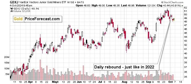 Meanwhile, the junior mining stocks are after an invalidation of the breakout above their July highs, most likely leading the rest of the precious metals market lower. Just like it was the case in mid-2023 – the decline in the GDXJ is more visible than the one in gold.