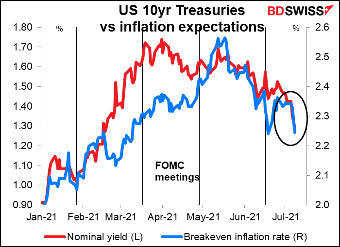 The idea that demand from both the personal and government sectors may be peaking could be why bond yields have been coming down so quickly. They’ve been coming down faster than inflation expectations, which are still elevated because of supply-chain bottlenecks that are likely to last for some time. That has caused a steep drop in US real yields. Surprisingly, this hasn’t hurt the dollar at all – quite the contrary. This is a big break from the recent trend.