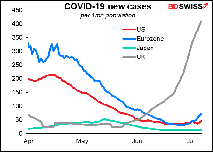 What’s going on? The main thing seems to me to be the sudden increase of new virus cases as the new, more virulent delta variant spreads rapidly. The UK is the worst example, but there are others too – Spain has increased 3.6x in the last 10 days, while here in Cyprus, we hit a record 962 cases Wednesday – over 10x the level of just a month ago.