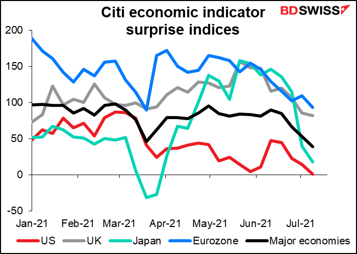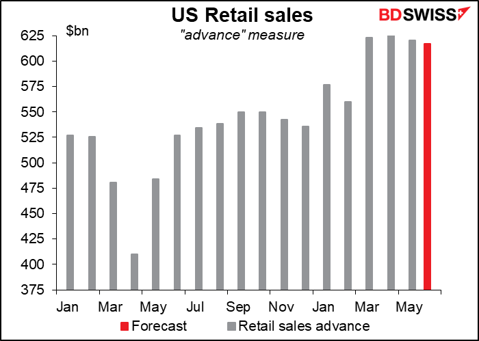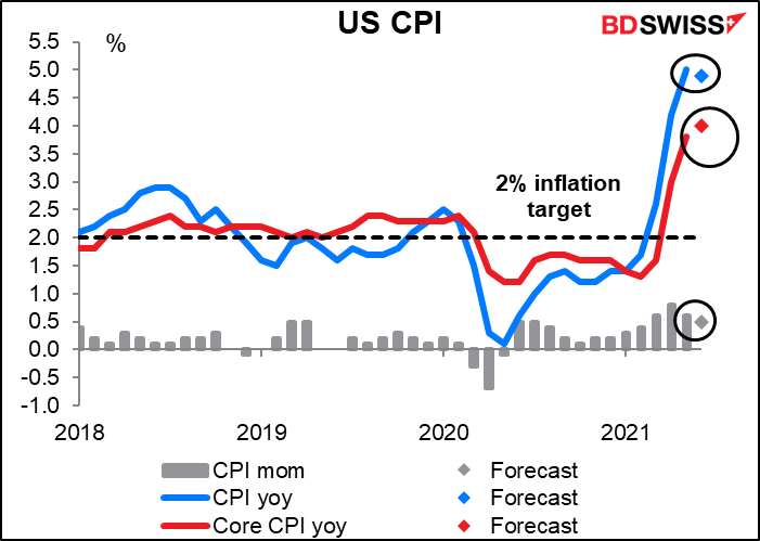 The headline figure is expected to fall by 10 bps, while the core figure is forecast to advance by 20 bps. The market seems to pay more attention to the headline figure than to the core figure though so the fact that it backs off from 5% yoy may be significant. The mom rate of increase is also expected to fall a bit to +0.5% mom from +0.6%. This could encourage investors to think that the worst is over for inflation, it is indeed likely to be transitory as the Fed has been saying, and there’s no urgency to tighten policy any time soon. That would be good for stocks. The impact on the dollar is harder to say. Recently the dollar has been acting as a “safe haven currency,” along with the yen, which suggests that it might cause the dollar to weaken. On the other hand, we discussed above how a stronger dollar goes along with lower US rates and a flatter US yield curve. That means it could push the dollar higher, too.