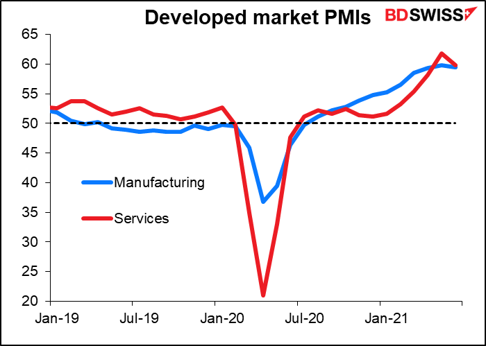 …and part is because the “V”-shaped recovery has hit the right-hand edge of the “V”. The latest manufacturing purchasing managers’ index (PMI) fell slightly (to 59.5 from 59.8) while the service-sector PMI was down more notably (59.8 from 61.8). That doesn’t mean the global economy is grinding to a halt by any means, but it just means that the period of the most rapid expansion is probably over.