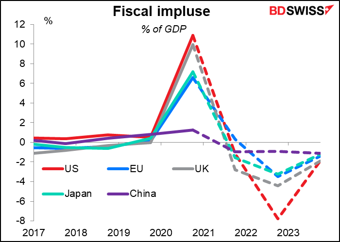 That means the “fiscal impulse” – the contribution to growth coming from additional fiscal spending – will be negative for the next two years. It’s not the size of the deficit that matters for growth, but rather the change from one period to another. In this case, the deficits will be shrinking, and that means governments’ contributions to growth will be contractionary even as they run a stimulative fiscal policy (just not as stimulative as in the previous year).