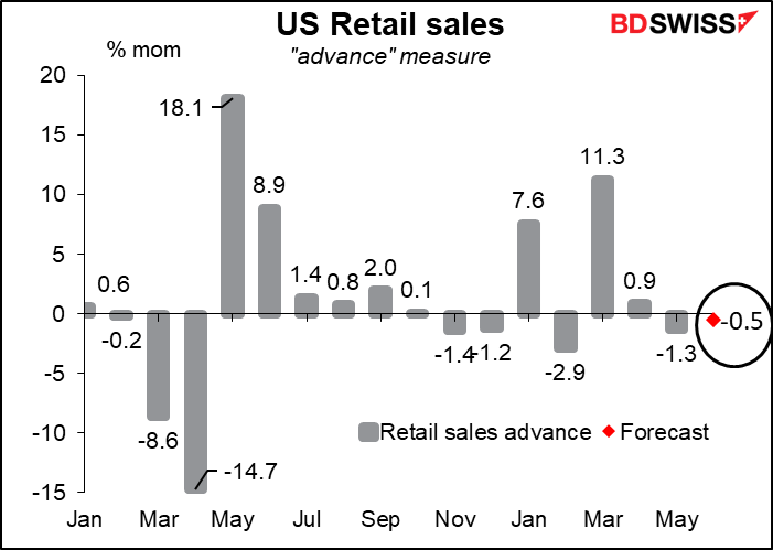 The other major US indicator due out during the week is retail sales on Friday. It’s expected to be down mom again as the impact of the March supplementary payment continues to fade.