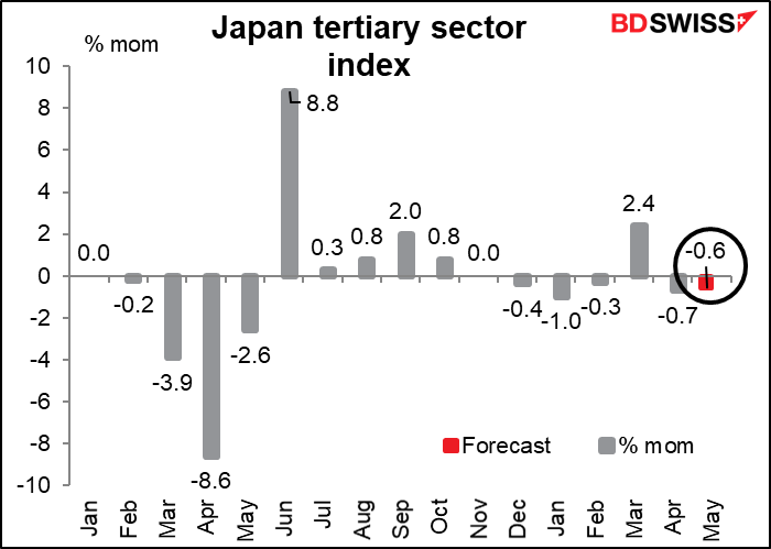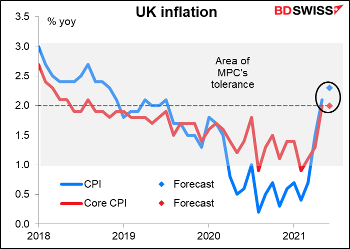 Q2 CPI comes out on Friday; I don’t know if they’ll have the data in time for Wednesday’s meeting, but the forecast is for a leap to 2.7% yoy, near the top of their 1%-3% target band. That’s higher than anticipated in the April MPS, which said they expected inflation to peak at around 2.6% in the near term. Moreover they said they expected this level to be transitory and for inflation to fall below 2% next year “and only return to the midpoint of the target range over the medium term as capacity pressures emerge more sustainably.”