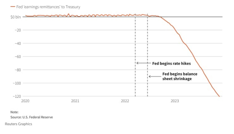 Under the Federal Reserve charter, the central bank remits net operating profits to the U.S. Treasury. This serves as an income source for the federal government and lowers the budget deficit. But when the Fed loses money, the Treasury loses its payday. That results in even bigger budget deficits.