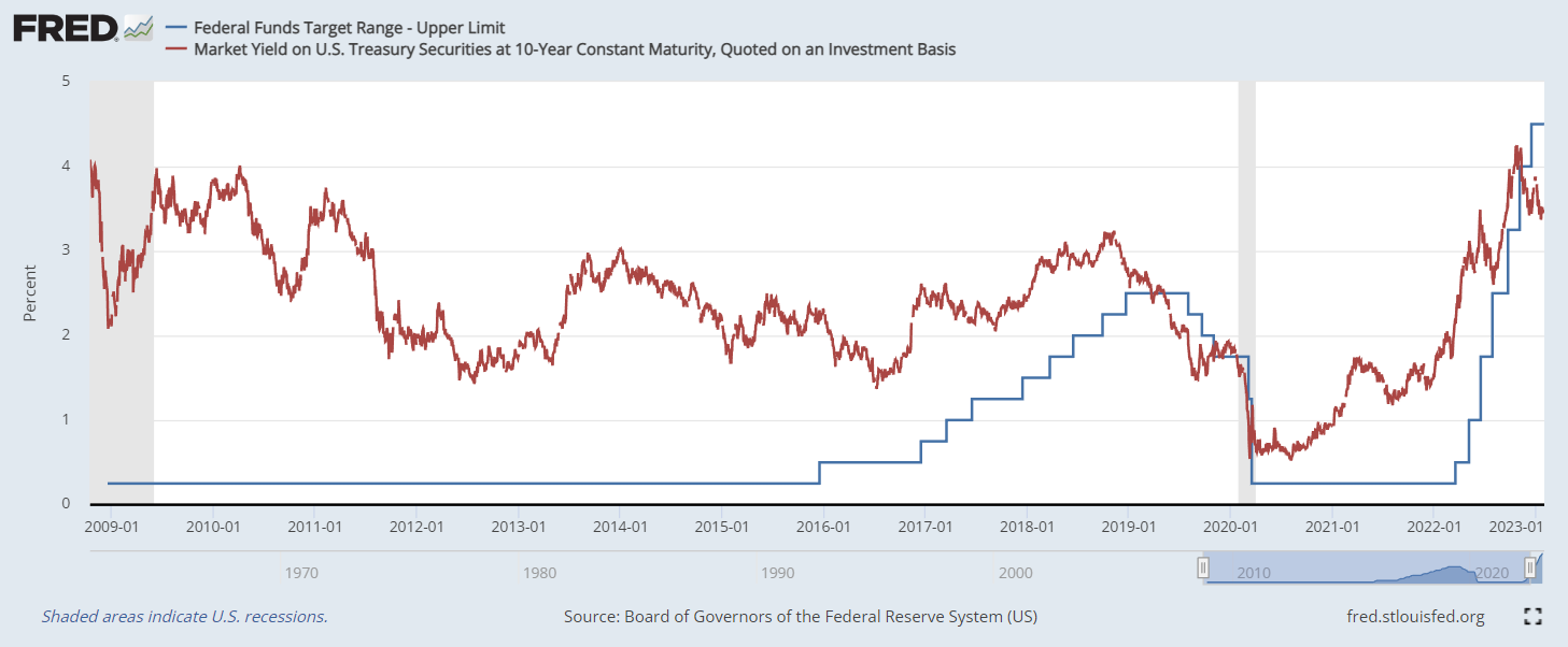 Treasury yields reversed in early November and continued to fall even as the Fed hiked 0.5% on December 14 and raised the 2023 terminal rate in its Projections Materials from 4.6% to 5.1%.