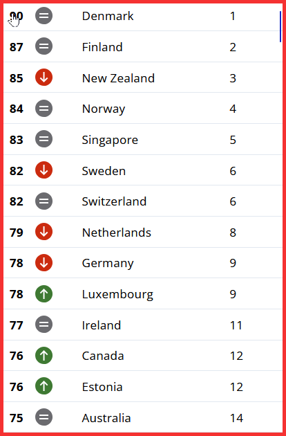 The US ranking will fall. Now it’s a ranking of 69, compared to 100 as “very clean.” (https://www.transparency.org/en/cpi/2023). The US is less clean than the UK, Austria and France, all at 71.