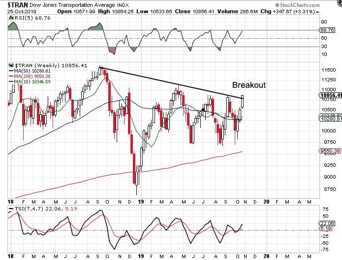 SPX pushed a little higher last week, breaching the recent high of 9/15 by a tad, and challenging the all-time high of 3028 which is likely to be surpassed before this move is over. This “exuberance” does not come as a surprise, since it was expected. But avid bulls may soon be dismayed as the 40-wk cycle finally takes hold and causes a sharp plunge (perhaps as early as next Wednesday) when the Fed is expected to announce another rate cut. As ArnoutterSchure of Intelligent Investing points out, the great majority of Fed decisions on interest rates since 2016 have been followed by a market correction of varying degrees. So, since the 40-wk cycle low is deemed to be late and still ahead of us, and since this is supported by other cycles topping in early November (Eric HadikInside Track),it’s clear that the odds favor the rally from 2856 coming to an end atabout that time.