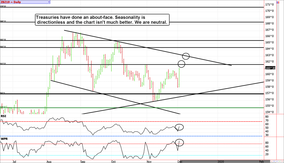 Treasuries appear to be benefiting from the stock market's losses as investors allocate away from risk and toward what they believe to be safer assets. Gold and sliver also went along for the ride. Yet, we aren't ready to jump on the bond bandwagon just yet. Treasury seasonals are mixed, at best, and the chart is unconvincing. At this time, we are neutral and have little insight to offer.