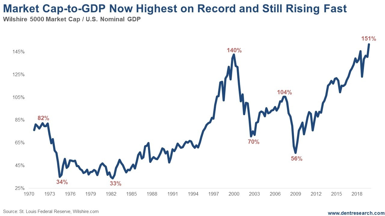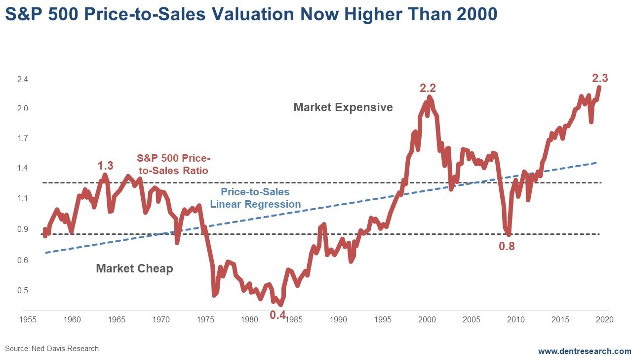 In the past, I have shown that we were at the highs for key valuation indicators even though we were not for the current favorite: the Shiller CAPE P/E Ratio. That was 44 at the top in early 2000 and has been as high as 33 in 2018. CAPE means “cyclically adjusted for 10-year average earnings,” which is better, as earnings can be so volatile, especially around tops and downturns.
