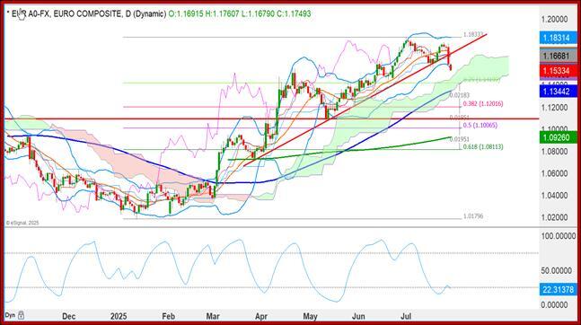 If we draw a classic Fibonacci retracement from the low on Jan 10 to the high on July 1, the 38% retracement lies at 1.1202. The 50% retracement lies at 1.1007. If we take the midpoint, it lies at about 1.1090. Fib retracements are superstitious hooey, but so many traders believe in the idea that it often becomes self-confirming.