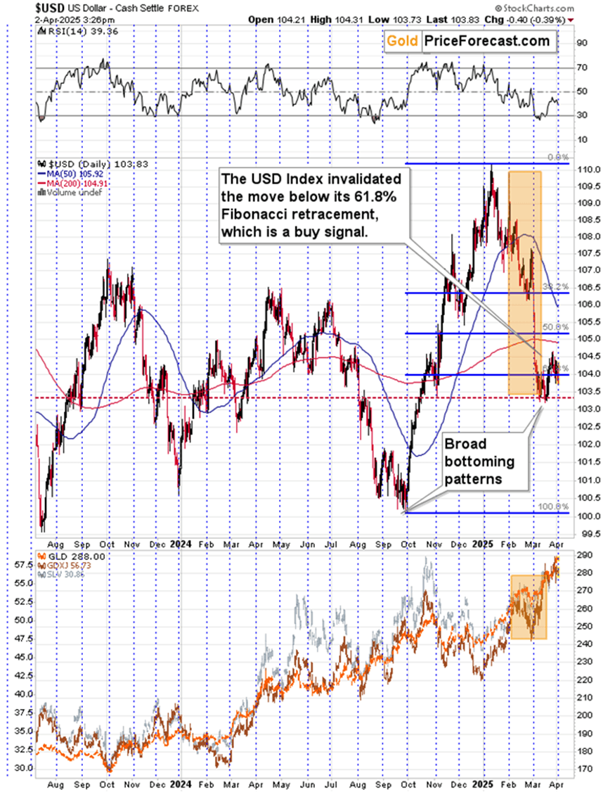 You see, markets often move on the rumor and reverse based on the fact. Gold and copper seem to have rallied based on the rumor that the tariffs are going to be increased today (which Trump called the “Liberation Day”). The above rule suggests that those moves can now reverse, and this would perfectly align with long-term technical charts for both: gold and copper.