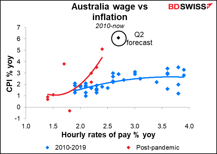 Australia releases its wage data (Wed) and employment (Thu). The wages data in particularly is a Very Big Deal as the Reserve Bank of Australia (RBA) frequently pointed to the need for wages growth to get up to a level consistent with inflation in its 2%-3% target range. This data is available only quarterly and so can have a big impact when it comes out. Wages are forecast to have risen 2.7% yoy, which in the pre-pandemic world would’ve been compatible with inflation of around 2.8% yoy – quite firmly within the RBA’s 2% -3% target range. This should allow them to continue to normalize monetary policy, which is likely to be positive for AUD.
