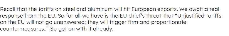 Yesterday Trump upped his bully bet by naming a 25% tariff on all European imports. So far the screams of outrage are subdued. Something is going on, maybe. Perhaps waiting for the hammer to drop is a tactic while talks go on behind closed doors. Or maybe the EU has a killer response under wraps to release at the right moment.