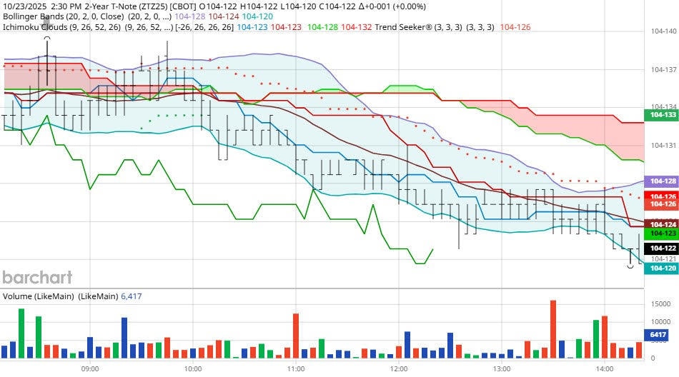 Yesterday the ZT dived Lower at around 7:30 AM EST with no other economic news in sight. The Dow climbed Higher at the same time. Look at the charts below and you'll see a pattern for both assets. The Dow climbed Higher at around 7:30 AM EST and the ZT dived Lower at around the same time. These charts represent the newest version of Bar Charts, and I've changed the timeframe to a 15-minute chart to display better. This represented a Short opportunity on the 2-year note, as a trader you could have netted about a dozen plus ticks per contract on this trade. Each tick is worth $6.25. Please note: the front month for ZT is now Dec '25 and the Dow is now Dec '25. I've changed the format to filled Candlesticks (not hollow) such that it may be more apparent and visible.