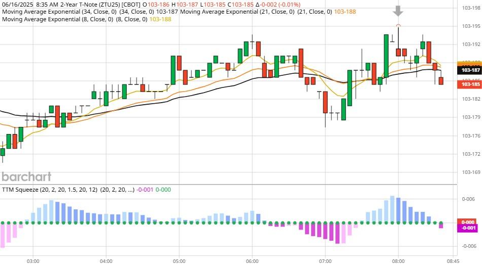 Yesterday the ZT dived Lower at around 8:30 AM EST with no news pending. The Dow climbed Higher at the same time. Look at the charts below and you'll see a pattern for both assets. The Dow climbed Higher at 8:30 AM EST and the ZT dived Lower at around the same time. These charts represent the newest version of Bar Charts, and I've changed the timeframe to a 15-minute chart to display better. This represented a Short opportunity on the 2-year note, as a trader you could have netted about a dozen ticks per contract on this trade. Each tick is worth $6.25. Please note: the front month for ZT is now Sep '25 and the Dow is still Jun '25. I've changed the format to filled Candlesticks (not hollow) such that it may be more apparent and visible.