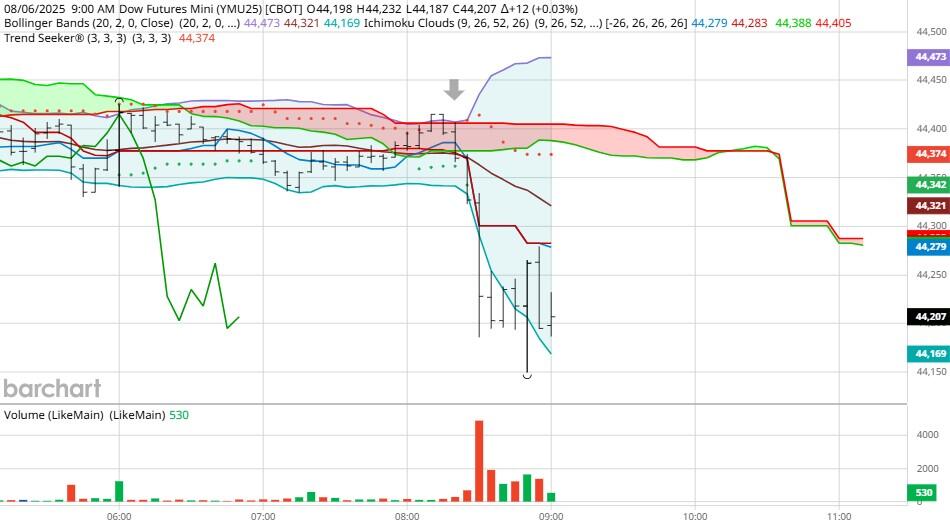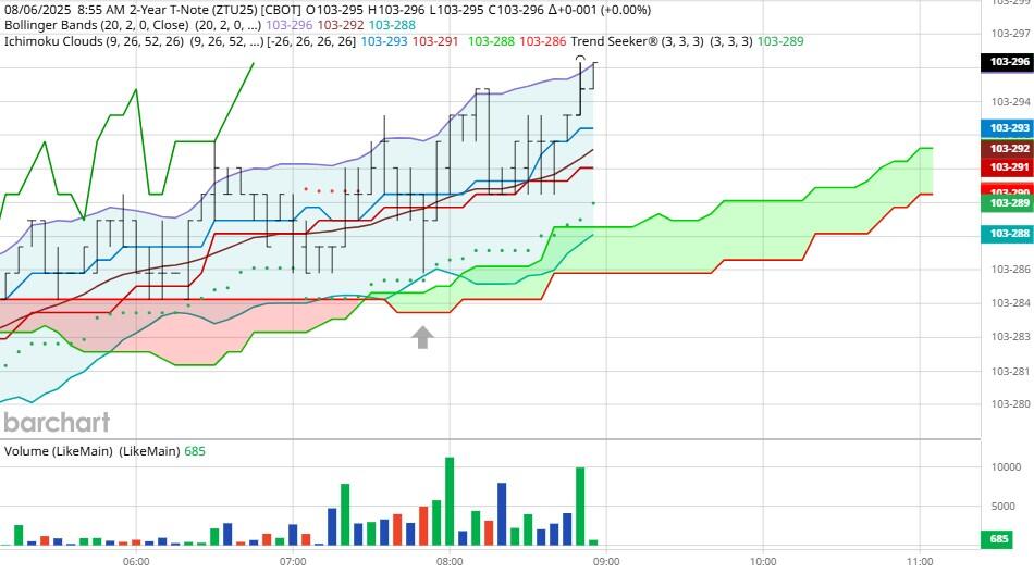 Yesterday the ZT climbed Higher at around 9 AM EST with no real economic news pending. The Dow dived Lower at the same time. Look at the charts below and you'll see a pattern for both assets. The Dow dived Lower at around 9 AM EST and the ZT climbed Higher at around the same time. These charts represent the newest version of Bar Charts, and I've changed the timeframe to a 15-minute chart to display better. This represented a Long opportunity on the 2-year note, as a trader you could have netted about a dozen ticks per contract on this trade. Each tick is worth $6.25. Please note: the front month for ZT is now Sep '25 and the Dow is now Sep '25. I've changed the format to filled Candlesticks (not hollow) such that it may be more apparent and visible.