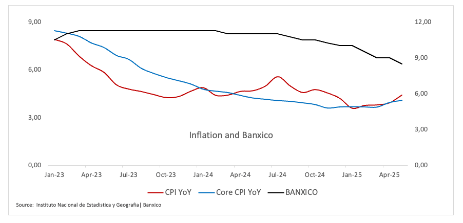 At its May 15 policy meeting, Banxico lowered its interest rate by half percentage point to 8.50% in a unanimous vote, at the same time leaving the door open to further rate cuts depending on the progress around inflation.