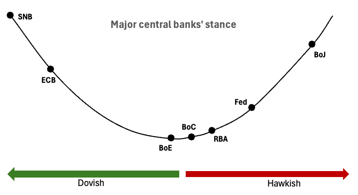 This week is expected to be relatively quiet, with few central bank decisions on the agenda. Amid ongoing uncertainty regarding trade dynamics and escalating concerns related to the Middle East crisis, central banks are anticipated to convey a prudent stance. Concurrently, they are likely to assess strategies aimed at bolstering their economies in the face of the current global trade volatility.