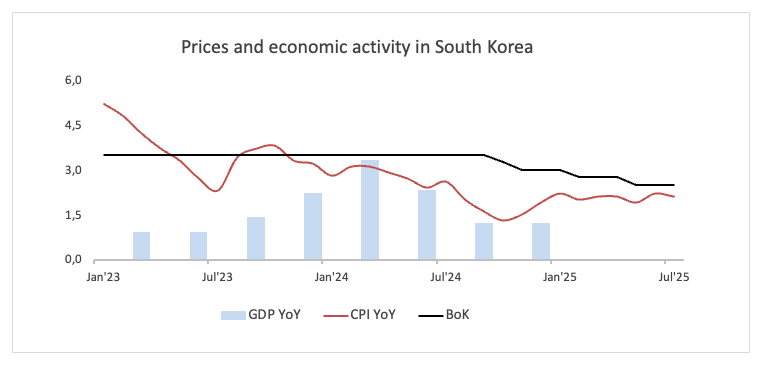 Investors see the BoK keeping a steady hand this week, leaving its policy rate at 2.50%. However, there is around 75% chance of a 25 basis point rate cut forecast for the October 23 meeting.