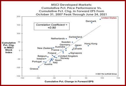 Lest we forget that growth leads asset prices, the always reliable Authers at Bloomberg has a doozie of an essay accompanied by this chart. We may think the US stock market is a bit bubbly. “The S&P 500 has risen 91.3% from its Covid panic low last March. With the year not quite half gone, it is up 14%. These are very impressive results, particularly with the latest consumer price index data showing the worst inflation in main street prices in almost three decades.
