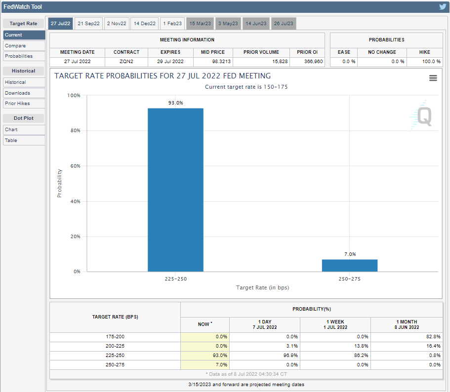 The more than respectable job growth was a boon to the Fed, whose anti-inflation rate hikes could be curtailed or ended if the economy slips into recession or job creation crashes. June payrolls virtually guarantee a 75 basis point increase at the July 27 Federal Open Market Committee (FOMC) meeting. Treasury futures have the odds for a three-quarters of a point hike at 93.0%, with 7.0% favoring a full 1.0%.