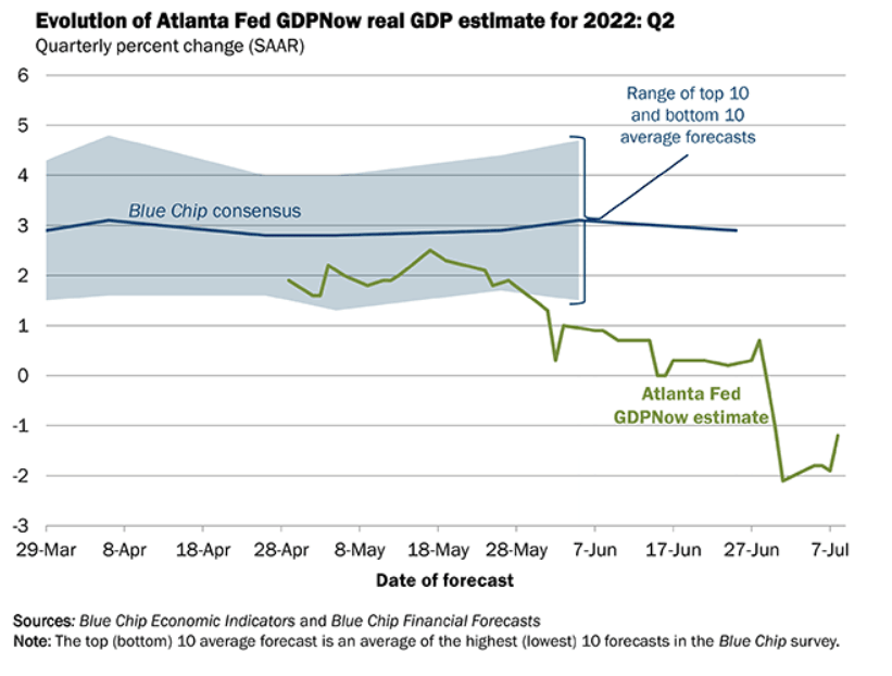The Atlanta Fed GDPNow model, which has charted the economy’s potential descent into recession, improved after the NFP release. Estimated second quarter GDP rose to -1.2%, up from -1.9% on July 7 and -2.1% previously.