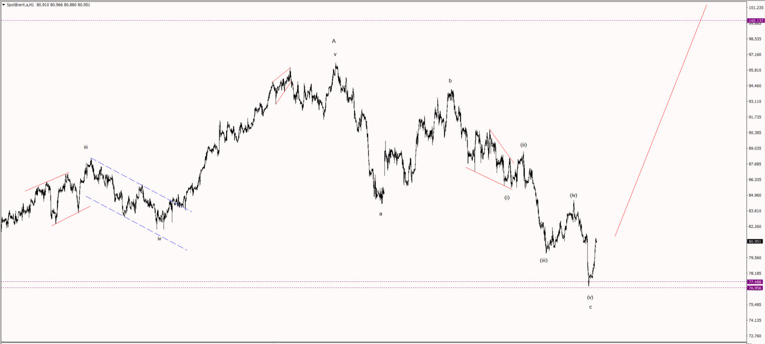 The chart below shows Brent which has completed a three-wave correction lower stopped at the 78.6% retraces of the wave A move higher. At this point, we believe wave B lower is complete and we can expect Brent to start climbing higher targeting a minimum of $100 a barrel into early 2024.