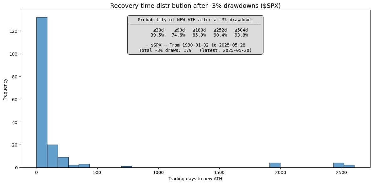 Since 1990 we have had 179 occurrences where we have experienced a -3% drawdown from the ATH. The probability of recovering to a new high in 30 days is 39% and 86% within 100 days.