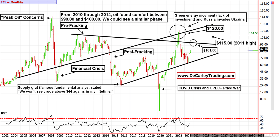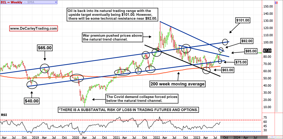 Like the monthly chart, the weekly chart of oil futures suggests a move to $101.00 is in play. Weakness earlier this year found support near the 200-day moving average and pushed prices into what we believe is an equilibrium range between $75.00 and $101.00. According to our charts, this is the natural price range that likely would have existed if the black swan events from 2020 through 2022 were removed.