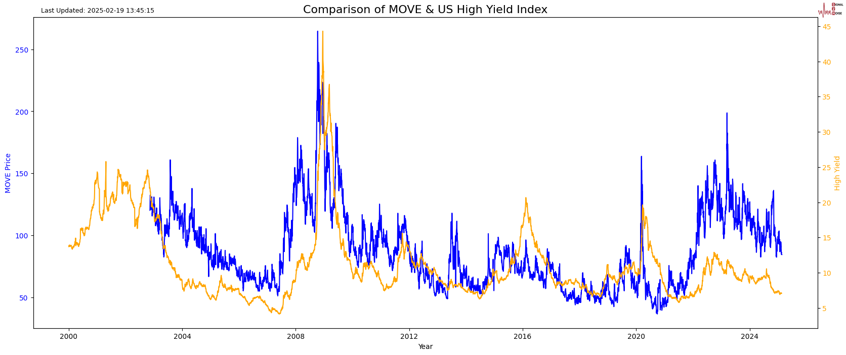 I believe the yield on high yield corporate bonds (junk) is too low. We are not that far from the levels that proceeded the subprime crisis. The MOVE index is to bonds what the VIX is to stocks. That is a measure of volatility. I think there are opportunities to trade around this theme.