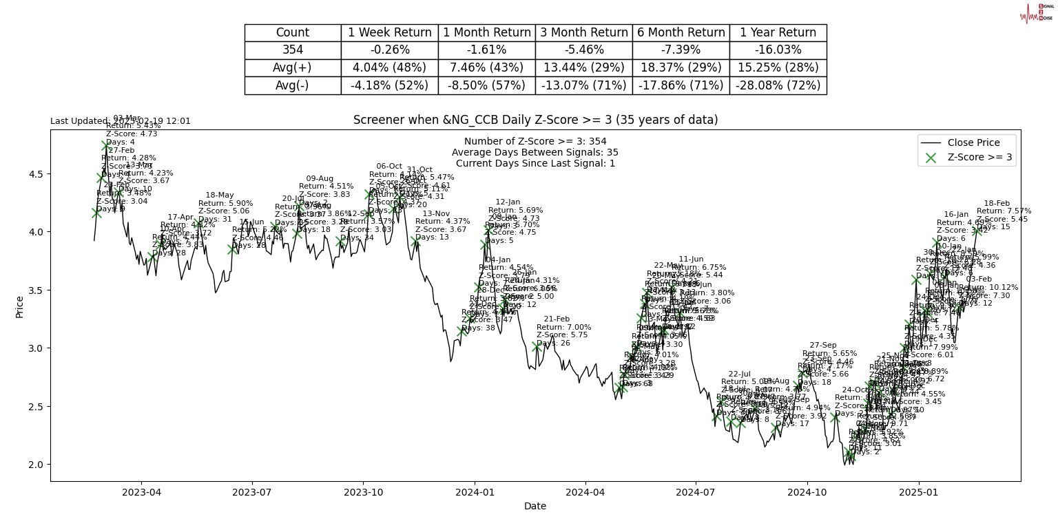 Natural Gas had another 3-sigma up day, which is not so natural. In theory, these should happen every 700 odd days, not every 35 days. Even though my stats look at 35 years of data, I only show the last 2 years so that the alerts are more readable, which is not the case with “Un”Natural Gas.