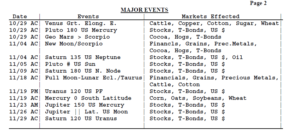 The November planetary analysis indicates that the best areas to monitor this month are: 1) T-Bonds; 2) Stocks; 3) Oats; 4) Wheat; 5) Soybeans; 6) Corn; 7) US $; 8) Cocoa & Hogs; 9 tie) Cattle & Cotton; 10) Tokyo Stock Exchange; 11) Oil; 12) C.I../CRB; 13 tie) Gold & OJ; 14) Copper; and 15) Sugar.