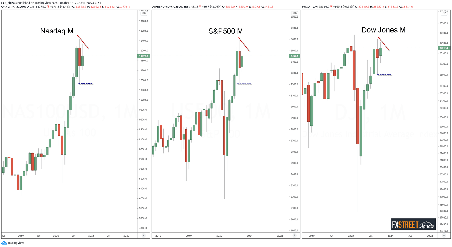 The three monthly charts depicting the US benchmark indices merits repeating again (we published a similar chart two weeks ago in the FXStreet Signals group) in order to gain a long-term perspective for risk appetite. In our analysis at the beginning of October, the most outstanding signal on these charts were the Japanese reversal patterns emerging on monthly candles.