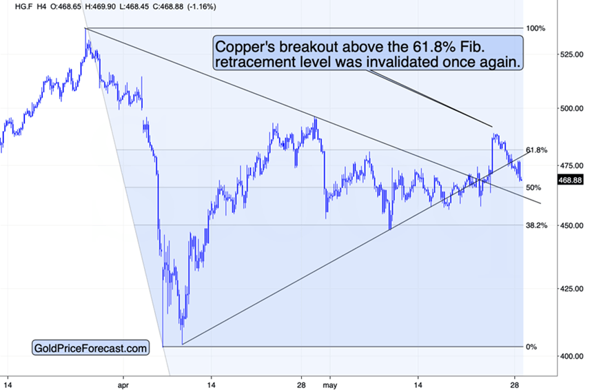 That’s what copper has been doing recently – it moved back below its rising support line, and it invalidated the breakout above its 61.8% Fibonacci retracement level.