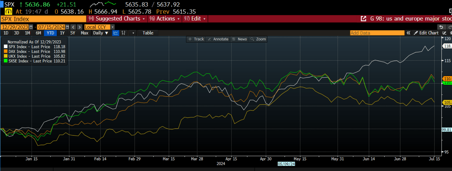 The divergence between US blue chip stocks and their European counterparts started in early June, at the same time as Trump’s chances of winning the November election started to rise, as you can see below.