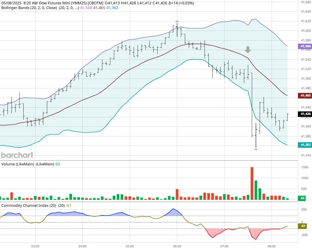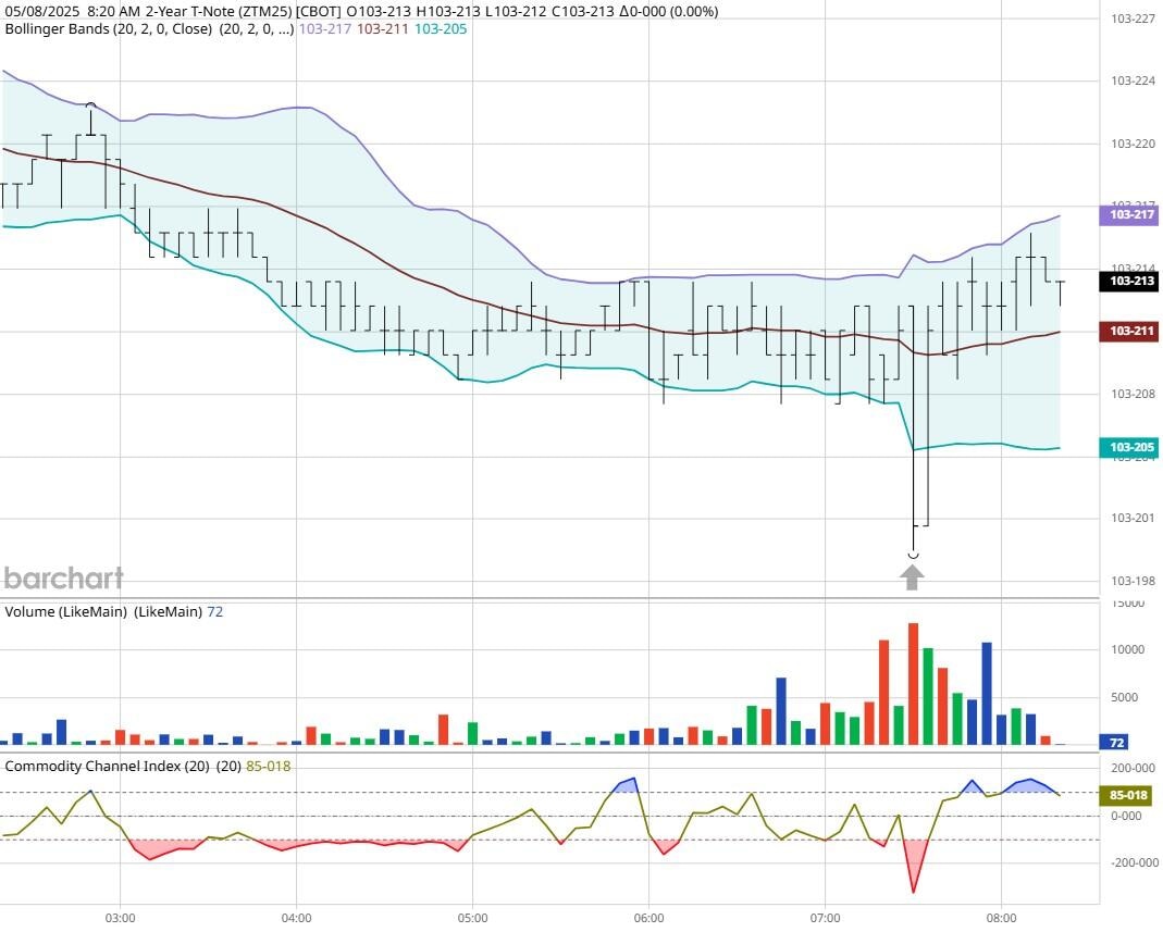 Yesterday the ZT climbed Higher at around 8:30 AM EST with Unemployment Claims pending. The Dow dropped Lower at the same time. Look at the charts below and you'll see a pattern for both assets. The Dow moved Lower at 8:30 AM EST and the ZT moved Higher at around the same time. These charts represent the newest version of Bar Charts, and I've changed the timeframe to a 15-minute chart to display better. This represented a Long opportunity on the 2-year note, as a trader you could have netted a dozen plus ticks per contract on this trade. Each tick is worth $6.25. Please note: the front month for ZT is now Jun '25 and the Dow is Jun '25 as well. I've changed the format to filled Candlesticks (not hollow) such that it may be more apparent and visible.