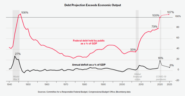 The first chart above shows that the U.S. budget deficit did not amount to double-digit negative figures for multiple years. Nonetheless, 2020 might be different due to COVID-19. Stimulus spending and lower revenues from the recession could trigger a 20%-30% deficit. Total national debt is the other important metric that shows when government spending encountered a head-on collision historically. The U.S. is probably crossing a 100% debt-to-GDP ratio this year. This metric had a historical default probability of about 2.2%.