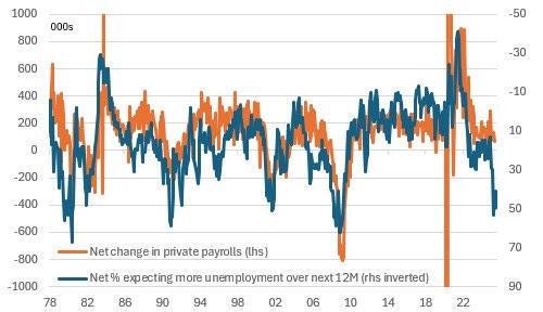 Households often feel the tremors long before the statisticians. They see the quiet hiring freezes, the whispered cutbacks, the colleague quietly shown the door. That front-line intuition builds into the survey before it bleeds into the payrolls data. Which means the market’s unease is not just about the last 22k print—it’s about the sense that the ground is shifting beneath workers’ feet. The signal here is clear: the risk of outright employment declines later this year is no longer theoretical, it’s becoming the base case in the minds of consumers themselves.